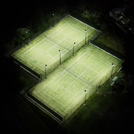 Results are outstanding with an average 450 lux on court at 0.73 uniformity over 2 courts, all with impressive cut off and low glare.